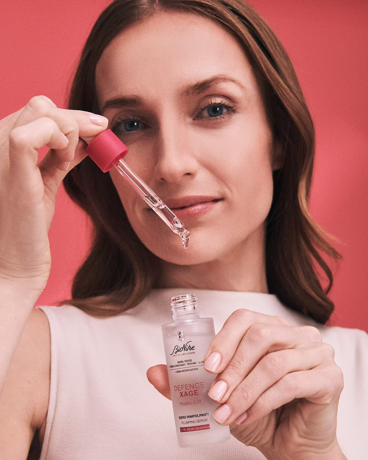 CONTIENE Ácido hialurónico (1,1 %) en tres pesos moleculares : Los diferentes pesos moleculares permiten obtener diversos beneficios: hidratación profunda, tersura y revitalización de la piel. En peso molecular alto, el ácido hialurónico forma una película sobre la superficie cutánea capaz de limitar la pérdida de agua transcutánea (TEWL) y restablecer el equilibrio hídrico cutáneo. En peso molecular medio y bajo, el ácido hialurónico atraviesa el estrato córneo de la piel para ser absorbido por las capas epidérmicas, proporcionando una hidratación profunda y efectos revitalizantes. Hexapéptido multifuncional: Con propiedades lifting, contrarresta arrugas, líneas finas y líneas de expresión, con una eficacia similar al Botox. Derivado del azúcar del sorbitol: Mejora la permeación de los principios activos, potenciando así los efectos hidratantes, redensificantes y antienvejecimiento. |