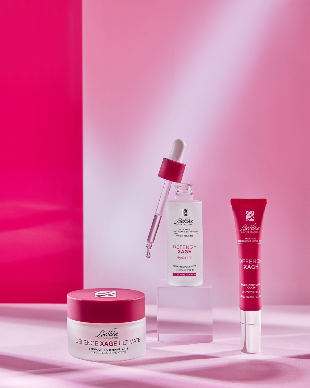 CONTIENE HYALU – LIFT PLUMPING SERUM Ácido hialurónico (1,1 %) en tres pesos moleculares : Los diferentes pesos moleculares permiten obtener diversos beneficios: hidratación profunda, tersura y revitalización de la piel. En peso molecular alto, el ácido hialurónico forma una película sobre la superficie cutánea capaz de limitar la pérdida de agua transcutánea (TEWL) y restablecer el equilibrio hídrico cutáneo. En peso molecular medio y bajo, el ácido hialurónico atraviesa el estrato córneo de la piel para ser absorbido por las capas epidérmicas, proporcionando una hidratación profunda y efectos revitalizantes. Hexapéptido multifuncional: Con propiedades lifting, contrarresta arrugas, líneas finas y líneas de expresión, con una eficacia similar al Botox. Derivado del azúcar del sorbitol: Mejora la permeación de los principios activos, potenciando así los efectos hidratantes, redensificantes y antienvejecimiento.